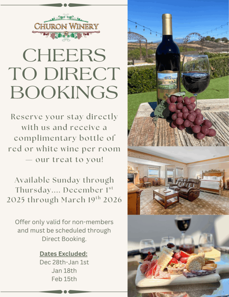 As you wind your way up the vineyard-lined entrance to the Chateau and Winery, the stately 40-foot high Grand Lobby Rotunda, perched atop 11 acres of estate vineyards, comes into view. Once inside the Grand Lobby, descend the marble staircase and enter the wine tasting bar where the aromas of aging wine tantalize your senses and entice you to spend time savoring the wine tasting experience with the award-winning wines of Churon. Take time to stroll the grounds and enjoy the sun-drenched vista views of the Temecula Valley, and the majestic snow-capped mountains in the distance.